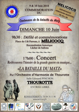 - le 10 juin 2018 : au ComplexePolyvalent de Thourotte, l’Orchestre d’Harmonie de Thourotte a présenté un spectacle musical créé spécialement pour les festivités organisées par la commune de Mélicocq pour le "Centenaire de la Bataille du Matz". Cette création met en scène un grand-père qui raconte à ses deux petits-enfants les grands évènements de la Grande Guerre. Des oeuvres et des projections sur écrans viennent illustrer cette évocation, en rendant notamment hommage aux pays qui ont participé à ce conflit. Un véritable spectacle commémoratif et pédagogique pour toute la famille !