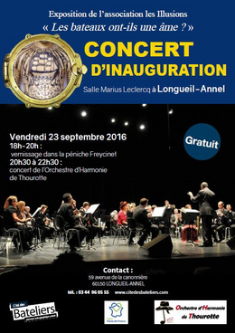 - le 23 septembre 2016 : à la Salle Marius Leclercq de LONGUEIL-ANNEL (60), Concert donné dans le cadre du vernissage de l'exposition "Les bateaux ont-ils une Âme ?" présenté à la Cité des Bateliers par l'association d'artistes "Les Illusions". A cette occasion, l'Orchestre d'Harmonie de Thourotte a proposé un Concert Inaugural sur le thème des bateaux.