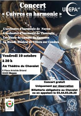 - le vendredi 10 octobre 2025 : l'Orchestre d'Harmonie de Thourotte a participé au concert organisé au Théâtre du Chevalet de Noyon, dans le cadre de la Semaine Départementale "CUIVRES EN HARMONIE", organisé par l'UDEPA60 (Union Départementale de l'Enseignement et des Pratiques Artistiques de l'Oise), avec le soutien du Conseil Départemental de l'Oise. Ce concert a réuni 4 orchestres de l'Est de l'Oise : l'Orchestre d'Harmonie de Noyon, Le Monde Musical de Villers-sur-Coudun, les Hauts de Gamme de Varesnes et l'Orchestre d'Harmonie de Thourotte. Ce concert a été dédié à la mémoire de Jean-Claude Le Bihan, musicien de l'Orchestre d'Harmonie de Thourotte et Président fondateur de l'association du Vignoble du Noyonnais, qui nous a quittés le 27 mai dernier : un hommage musical en reconnaissance de son engagement, sa passion et son dévouement au service de la vie associative et culturelle locale.