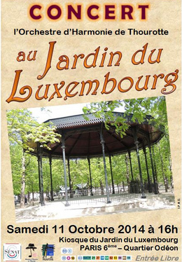 - le 11 octobre 2014 : CONCERT au Kiosque du Jardin du Luxembourg de PARIS en proposant des œuvres variées du répertoire classique et contemporain. (organisé à l'occasion des Festivités du 90ème Anniversaire de l'orchestre).