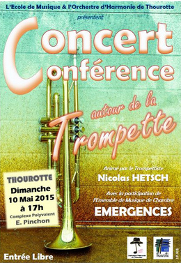 - le 10 mai 2015 : L'Ecole de Musique Municipale et l'Orchestre d'Harmonie de Thourotte ont proposé un CONCERT-CONFERENCE autour de la Trompette, sur l'initiative de notre trompettiste Nicolas HETSCH, au Complexe Polyvalent Edouard Pinchon de Thourotte. Ce rendez-vous a permis de découvrir l'histoire et l'évolution de la trompette de l'antiquité à nos jours, à travers des œuvres interprétées par Nicolas Hetsch, professeur de Trompette à l'Ecole de Musique de Thourotte. Il était accompagné par notre orchestre ainsi que par les élèves de la Classe de Trompette de l’Ecole de Musique de Thourotte et par l’Ensemble de Musique de Chambre « Emergences ».