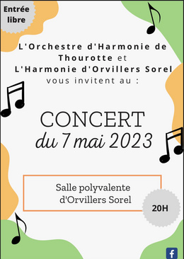 - le 7 mai 2023 : l'Orchestre d'Harmonie de Thourotte a été cordialement invité par l'Harmonie d'Orvillers-Sorel pour assurer la 2ème partie de leur Concert de Printemps. Nous y avons interprété des morceaux issus de notre programme "l'Orchestre d'Harmonie de Thourotte en Bal(l)ade", dont deux ont été joués en commun avec les musiciens d'Orvillers-Sorel.