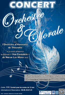- le 20 novembre 2016 : au Complexe Polyvalent Edouard Pinchon de THOUROTTE (60), l'Orchestre d'Harmonie a proposé un concert "Orchestre & Chorale" avec la Chorale "Vox Catabile" de Noeux-Les-Mines (62). Chaque ensemble a proposé un répertoire varié et pour le final, les 40 musiciens de l'Orchestre d'Harmonie et les 60 choristes se sont réunis sur scène pour interpréter ensemble deux œuvres en commun.